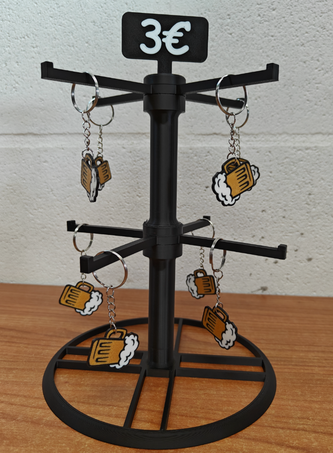 Este prático expositor foi pensado para valorizar ao máximo os seus chaveiros impressos em 3D. A estrutura é simples, mas funcional, com braços que permitem pendurar diversos chaveiros de forma organizada e facilmente visível.