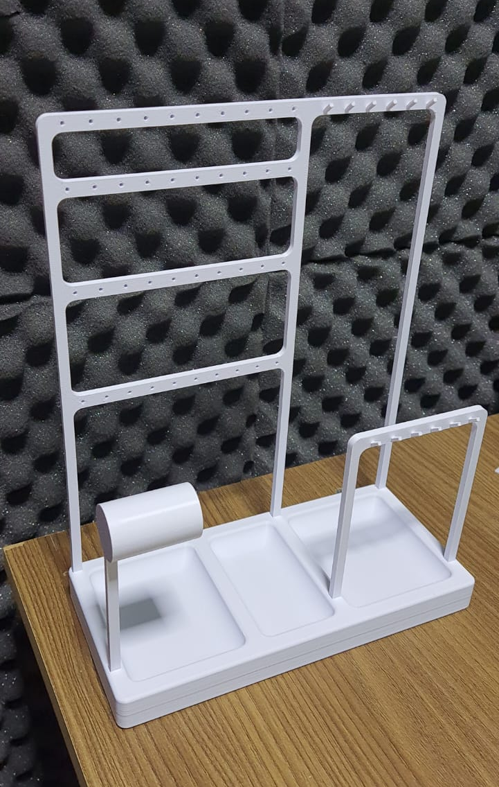 Diferente dos porta-joias fechados, este suporte expositor permite que você visualize toda a sua coleção de uma só vez, economizando tempo na hora de se arrumar. Sua estrutura aberta mantém as peças arejadas e evita o atrito direto entre elas, preservando o brilho e a integridade das suas joias por muito mais tempo.
